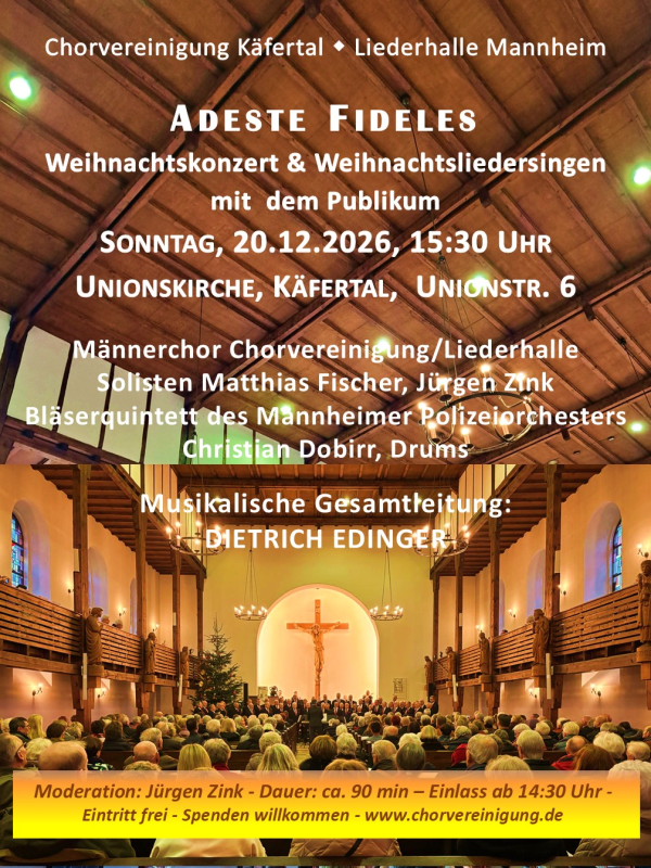 Konzert ADESTE FIDELES - 20. Dezember 2026, 15:30 Uhr - Ev. Unionskirche, Unionstr. 6, 68309 Mannheim Käfertal - Programm: Weihnachtskonzert & Weihnachtsliedersingen mit dem Publikum - Männerchor Chorvereinigung Käfertal/Liederhalle Mannheim - Bläserquintett des Mannheimer Polizeiorchesters - Musikalische Leitung: DIETRICH EDINGER