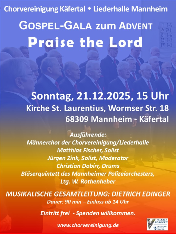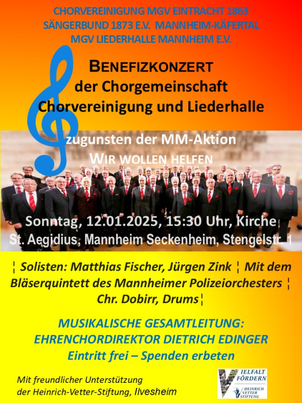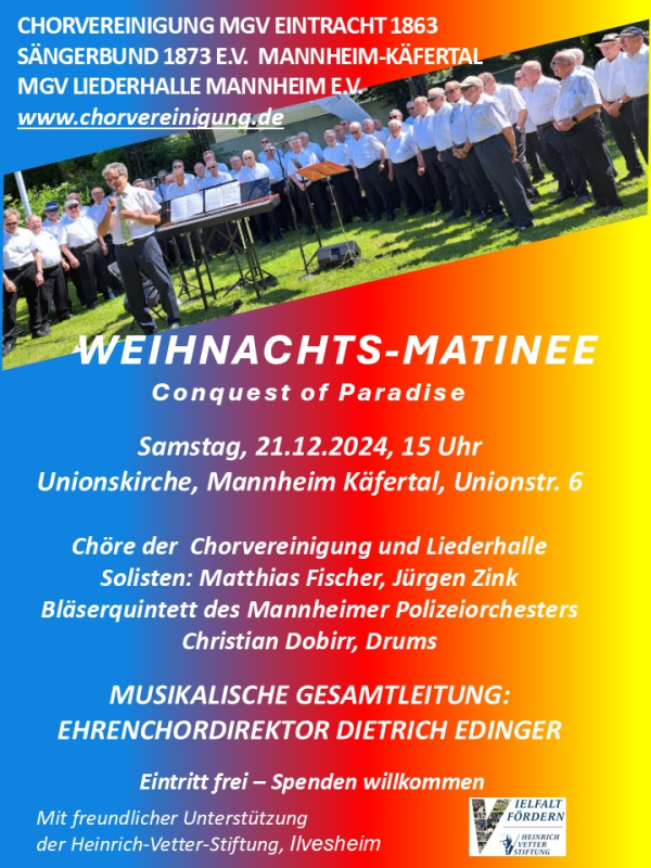 (MGC) — Als Dirigent mehrerer Chöre in der Region ließ Dietrich Edinger von Anfang an seine Chöre häufig zusammen auftreten. Unter der Bezeichnung Chorgemeinschaft Dietrich Edinger standen bei großen Veranstaltungen, wie zum Beispiel im Jahr 2000 bei der 1. Großen Chorgala im Rosengarten, die Chöre von Chorvereinigung Käfertal, Liederhalle Mannheim, Frohsinn Friedrichsfeld und Sängerbund Seckenheim gemeinsam auf der Bühne.