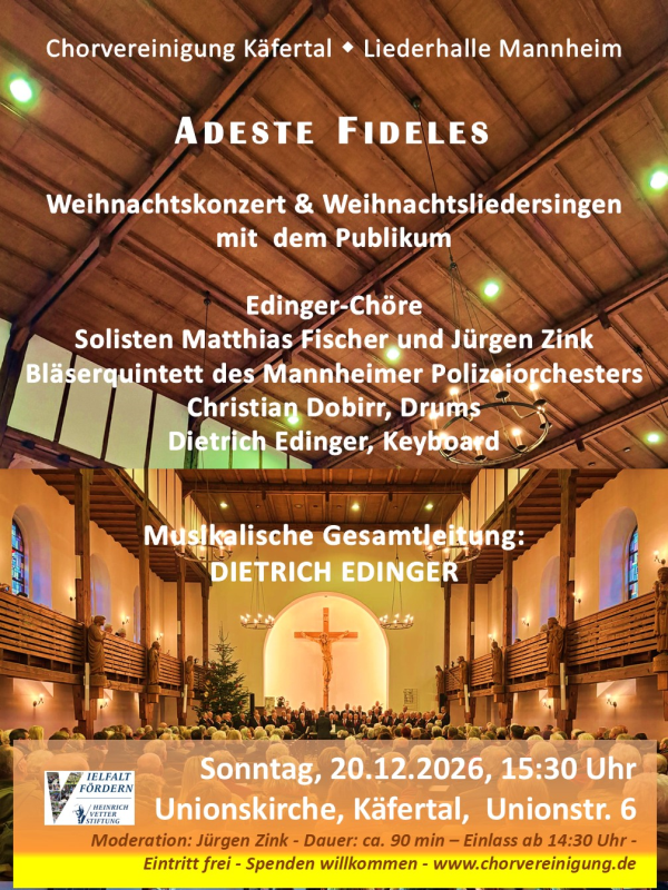 20. Dezember 2026, 15:30 Uhr, ADESTE FIDELES - Weihnachtskonzert & Weihnachtsliedersingen mit dem Publikum - Ev. Unionskirche, Unionstr. 6, 68309 Mannheim - Käfertal