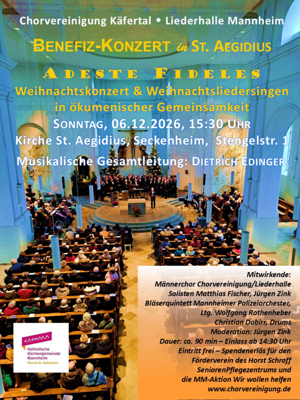 BENEFIZ-Konzert ADESTE FIDELES - 06. Dezember 2026, 15:30 Uhr - Kirche St. Aegidius, Stengelstr. 1, Mannheim Seckenheim - Programm: Weihnachtskonzert & Weihnachtsliedersingen in ökumenischer Gemeinsamkeit - Männerchor Chorvereinigung Käfertal/Liederhalle Mannheim - Bläserquintett des Mannheimer Polizeiorchesters - Musikalische Leitung: DIETRICH EDINGER